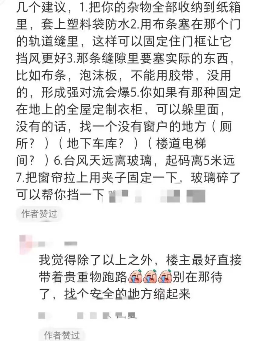 “还有网友劝我去避险层等安全位置,当时也打算先修,把重要物资都转移,如果风很大,就走安全楼梯往楼下撤。”