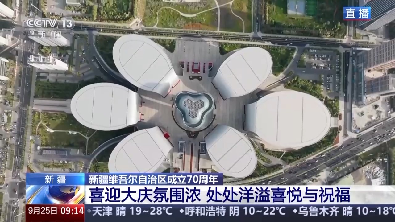总台记者 崔宁:近年来,新疆国际会展中心已举办多届中国-亚欧博览会等重大活动,是向世界展示新疆的一个窗口。另一侧是乌鲁木齐市文化新地标:“六馆一心”,从空中俯瞰,它就像一朵绽放的雪莲。这段时间,新疆维吾尔自治区成立70周年主题成就展就在这里举办,见证着70年来新疆面貌焕新、民生锦绣的巨大成就。
