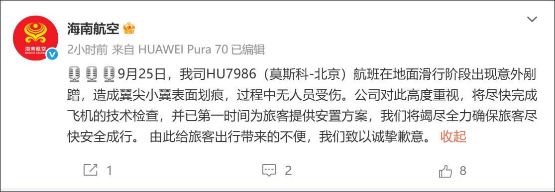 9月25日,我司HU7986(莫斯科-北京)航班在地面滑行阶段出现意外剐蹭,造成翼尖小翼表面划痕,过程中无人员受伤。公司对此高度重视,将尽快完成飞机的技术检查,并已第一时间为旅客提供安置方案,我们将竭尽全力确保旅客尽快安全成行。 由此给旅客出行带来的不便,我们致以诚挚歉意。
