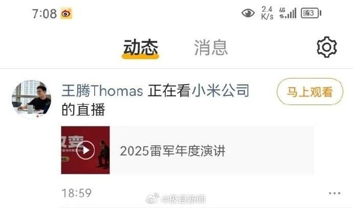 另据极目新闻报道,9月25日晚,微博显示王腾正在收看雷军演讲直播。9月8日,原小米中国区市场部总经理、REDMI品牌总经理@王腾Thomas 因泄密被辞退。