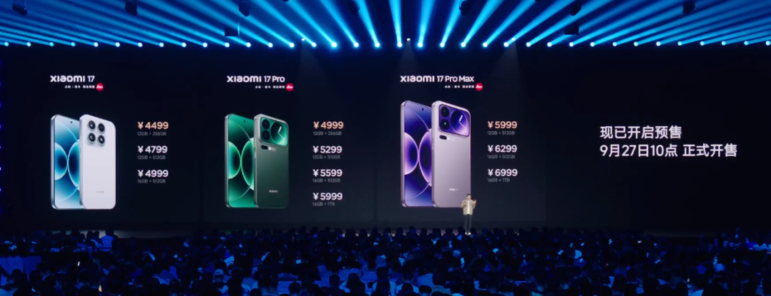 发布会上,小米宣布Xiaomi 17 Pro Max将直接从512GB版本起步,售价5999-6999元。