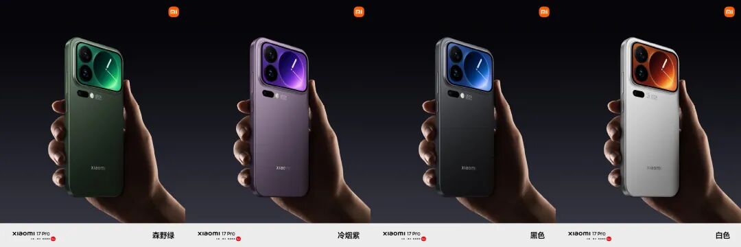 小米17Pro系列也有四款颜色,除黑白外,还有全新森野绿和冷烟紫。