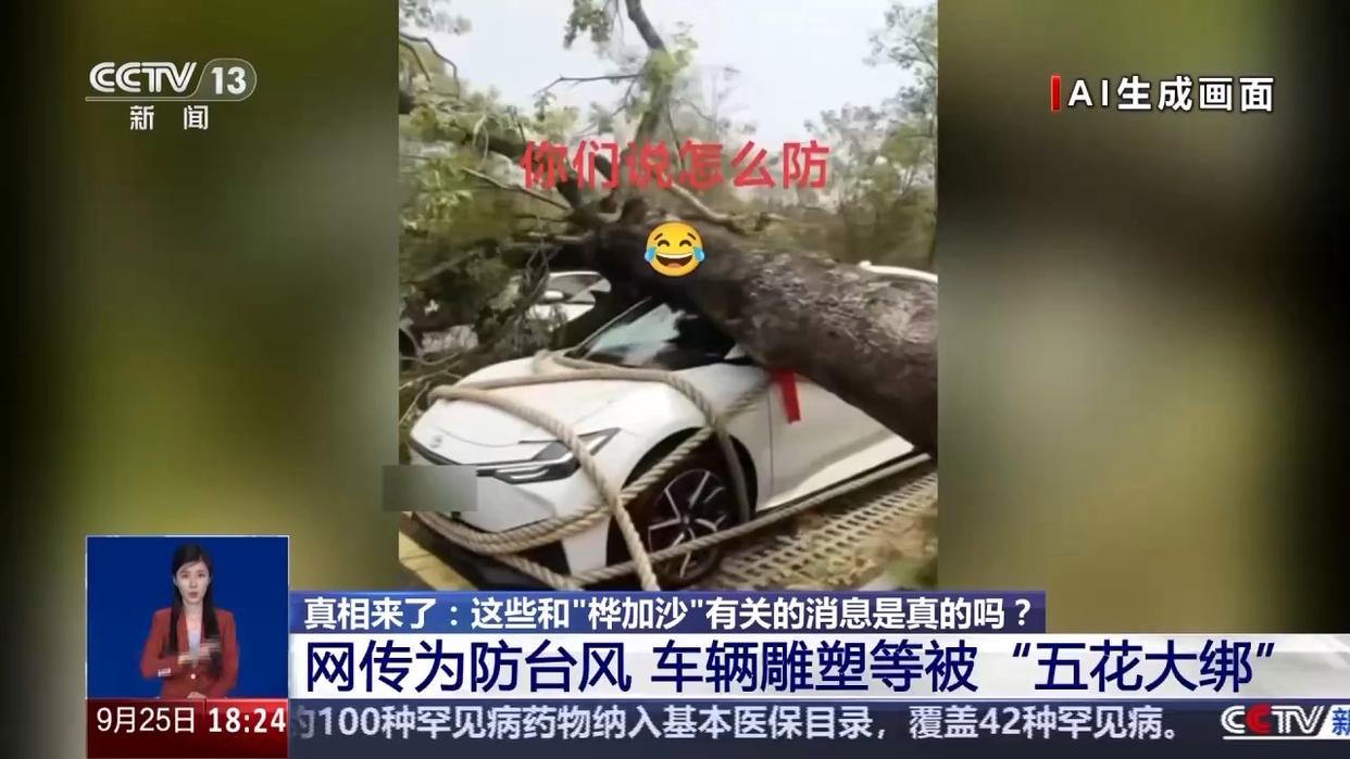 如有图片显示,车主为防止车辆被台风吹走,用麻绳将车子捆绑固定在地面,被网友称为“五花大绑”。更有图片显示,被“五花大绑”的车辆最终被倒伏的大树砸到。