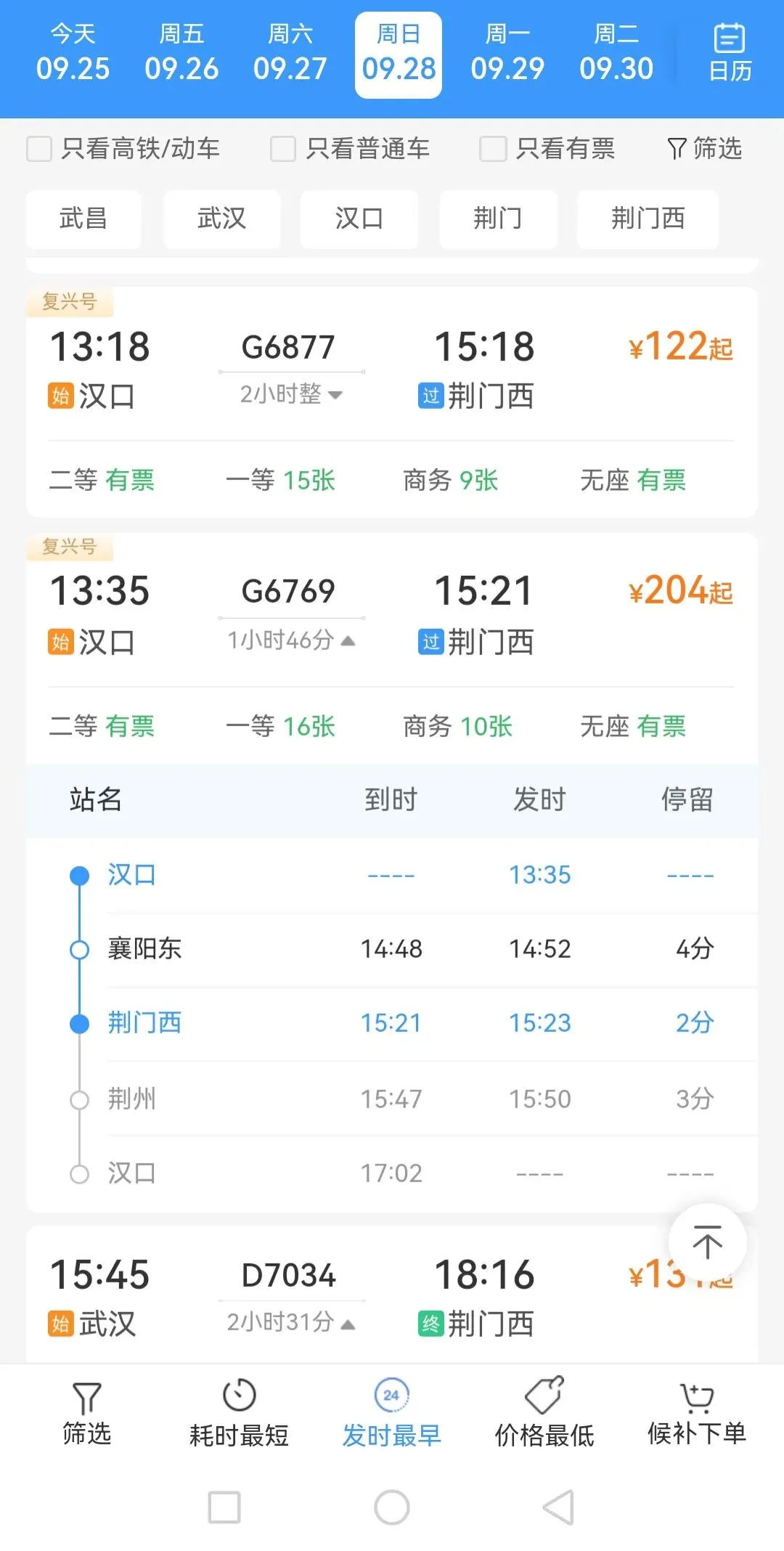 G6769,下午1时35分,从汉口出发经过襄阳东、荆门西、荆州,下午5时02分回到汉口站;