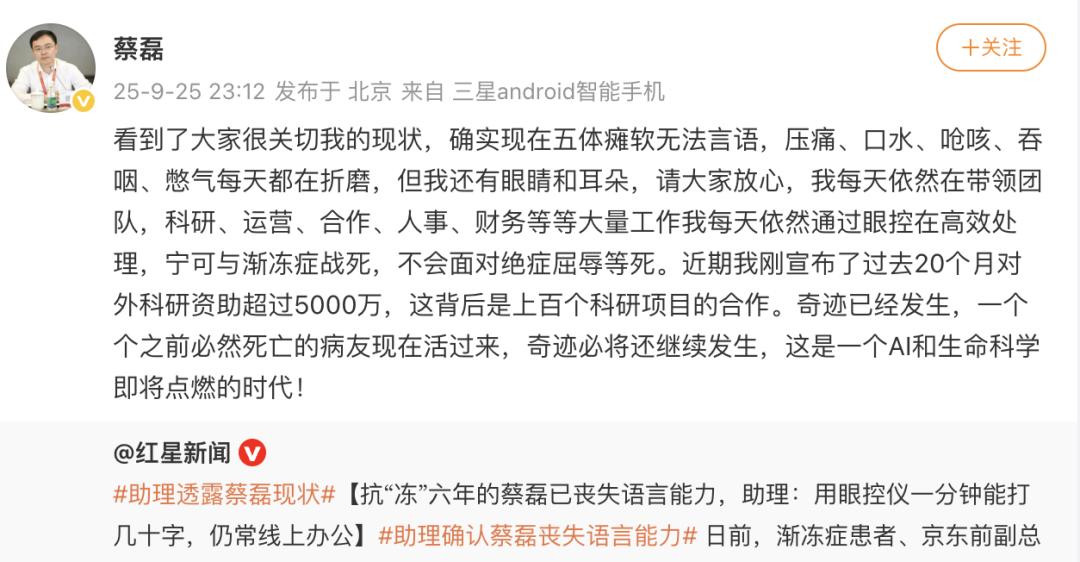 日前,渐冻症患者、京东前副总裁蔡磊的近况引发关注。9月25日,他的助理陈女士向红星新闻记者确认,蔡磊已经完全没有语言能力了。