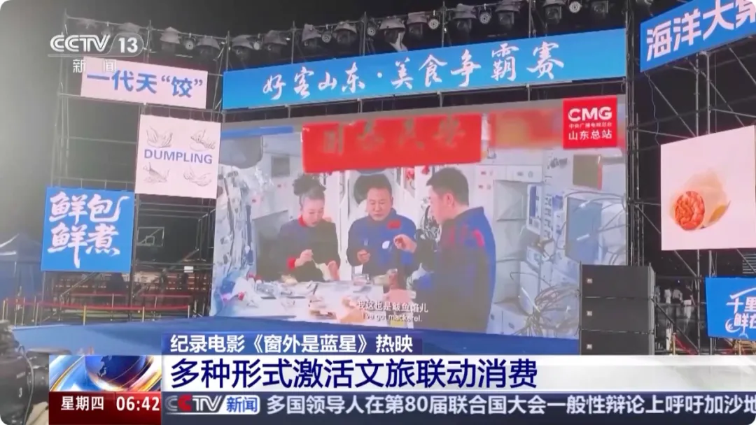 在电影《窗外是蓝星》中,展现了山东出品的鲅鱼水饺搭乘天舟三号货运飞船飞入太空,为航天员乘组提供在轨期间的传统节日食品的片段。在山东威海,随着环渤海开海,电影中提到的航天员的美食——胶东鲅鱼饺子也迎来了一波消费热。