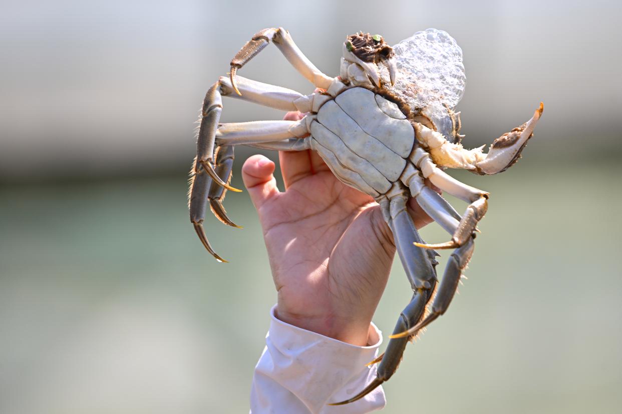 9月26日,蟹农展示捕获的阳澄湖大闸蟹。新华社发(王须中摄)