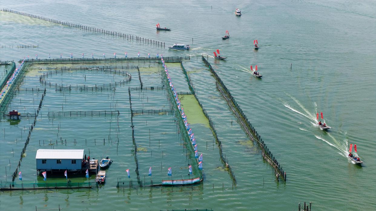 9月26日,捕蟹船只回到阳澄湖码头(无人机照片)。新华社发(王须中摄)