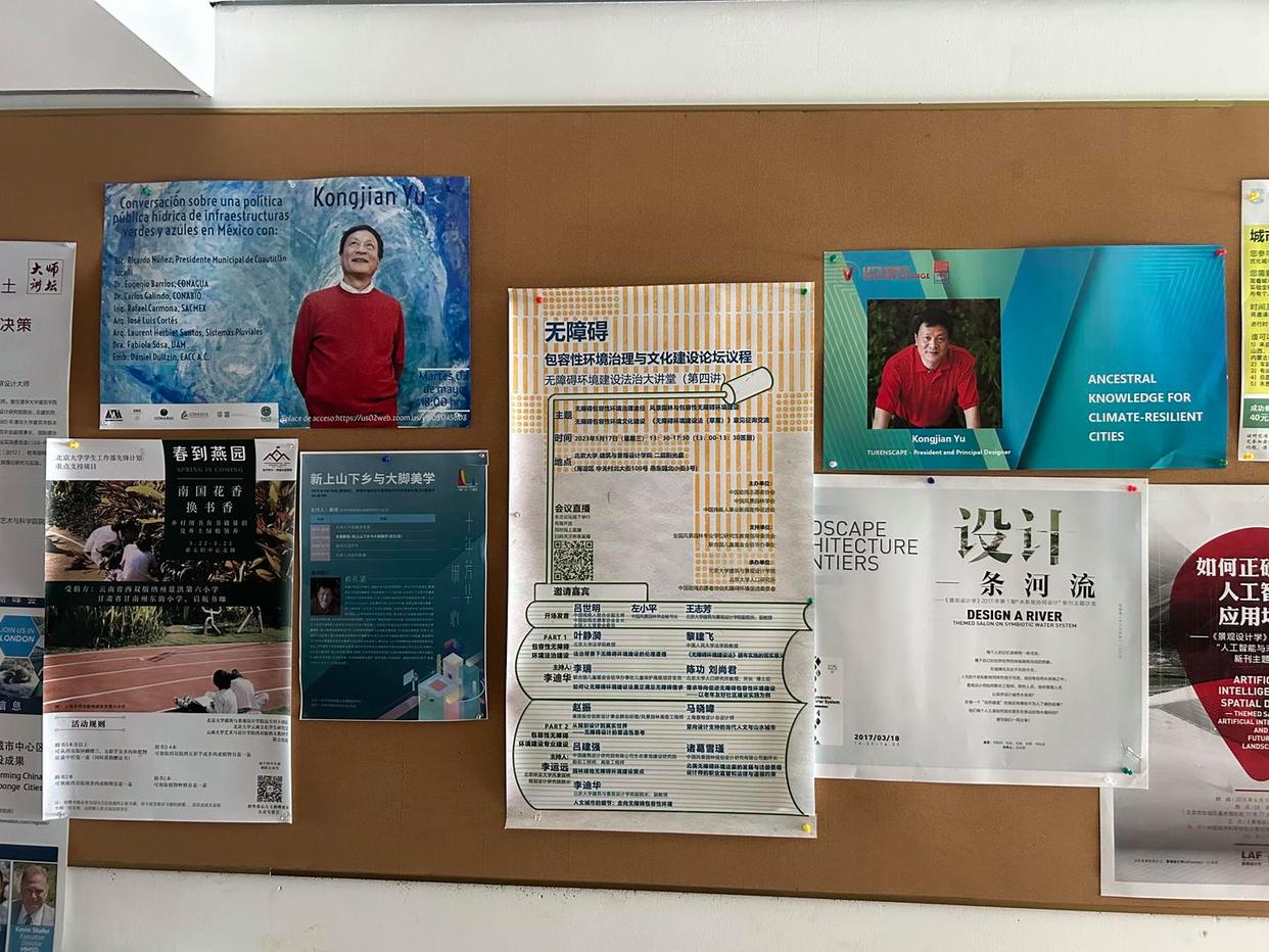 景观楼的二层是一个开放的空间,很多学生正在这里学习,走廊里的墙上,贴着历次学术讲座的海报,这其中不少是俞孔坚在世界各地所进行讲座、主旨演讲的海报。二层的户外有一处露台,中间的空地上种着一棵大树。“俞老师以前常在这里讲课,和学生交流,他喜欢让学生和自己团队的人走出户外,去项目现场,去接触当地的人。” 建筑与景观设计学院的一名学生说。