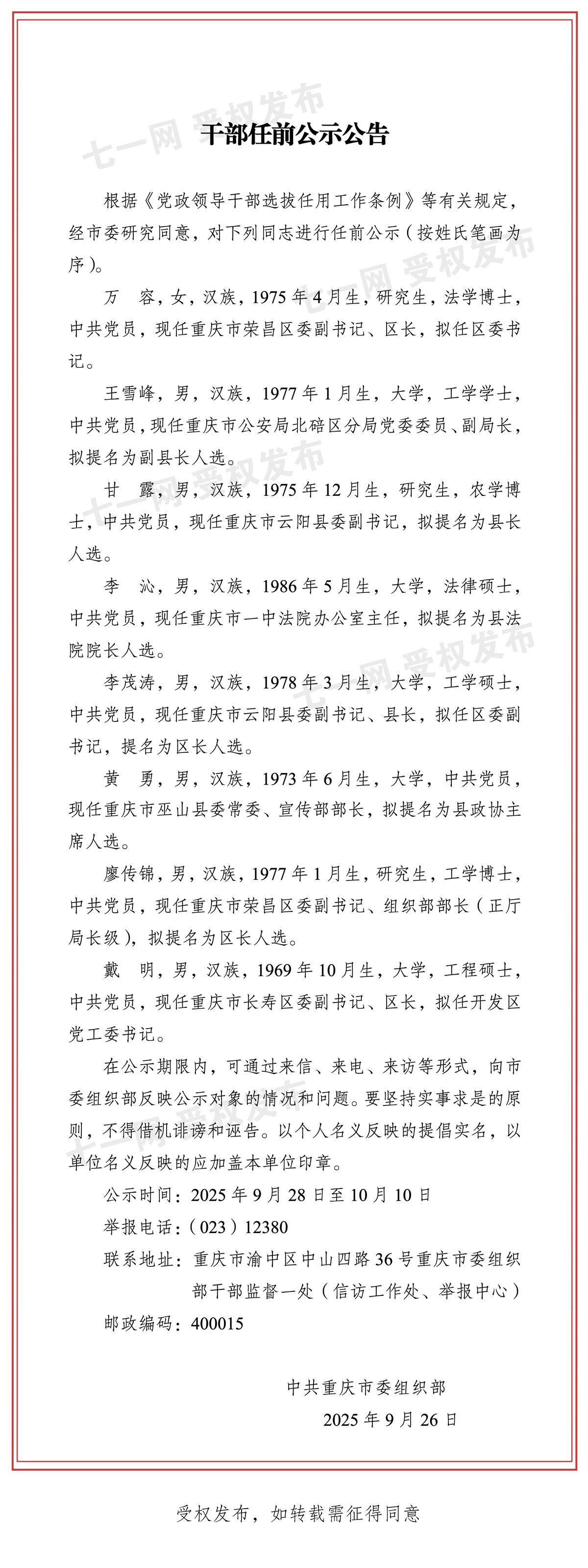 9月26日晚,重庆市委组织部发布干部任前公示公告,经市委研究同意,现任重庆市荣昌区委副书记、区长万容,拟任区委书记。