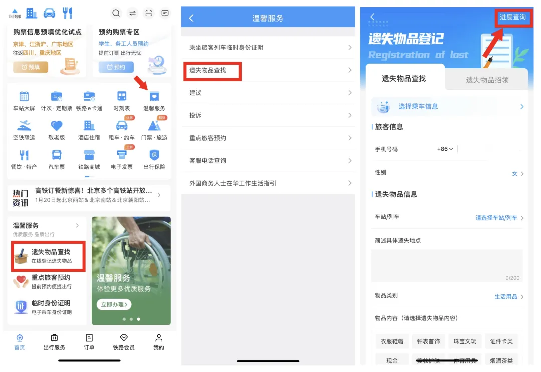 进入登记界面后,选择乘车信息,填写旅客信息以及遗失物品等相关信息,确认提交后,可以在右上角“进度查询”中查看物品寻找进度。