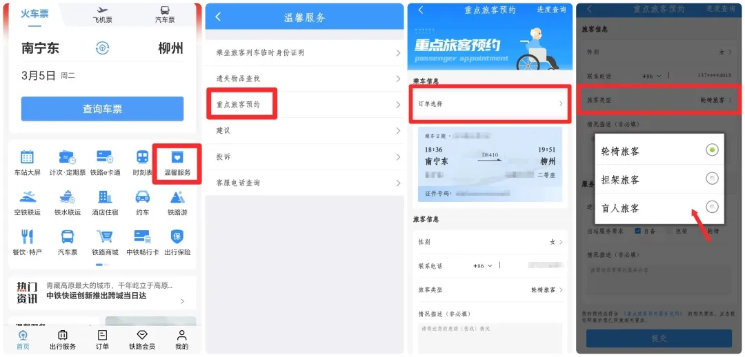 旅客在购买车票后,在12306APP首页,点击“温馨服务”进行重点旅客预约。