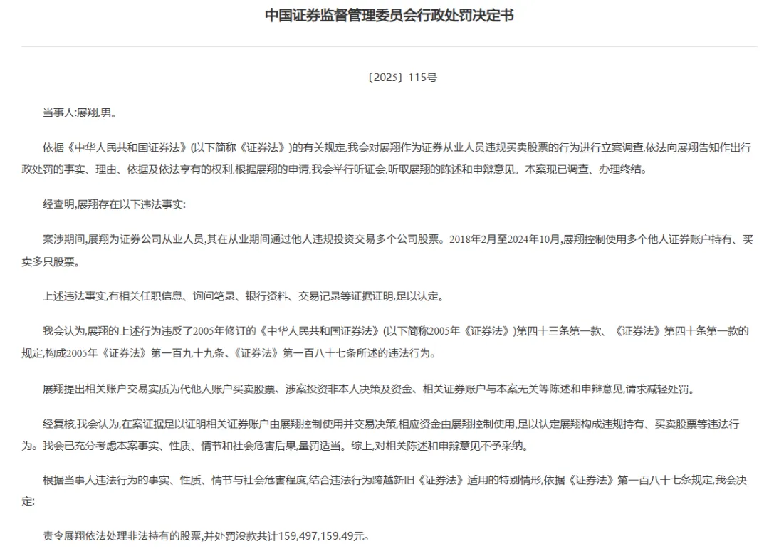 证监会责令展翔依法处理非法持有的股票,并处罚没款共计159497159.49元。
