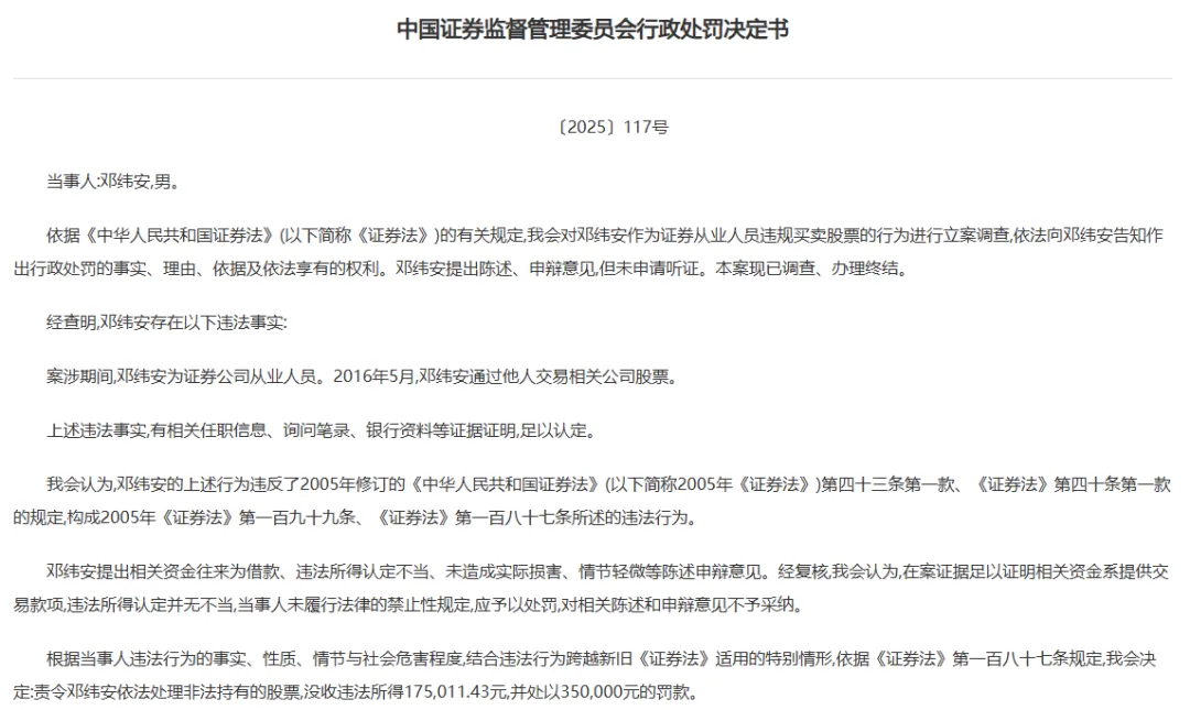 邓纬安为证券公司从业人员。2016年5月,邓纬安通过他人交易相关公司股票。证监会决定:责令邓纬安依法处理非法持有的股票,没收违法所得175011.43元,并处以350000元的罚款,合计罚没金额约52.50万元。