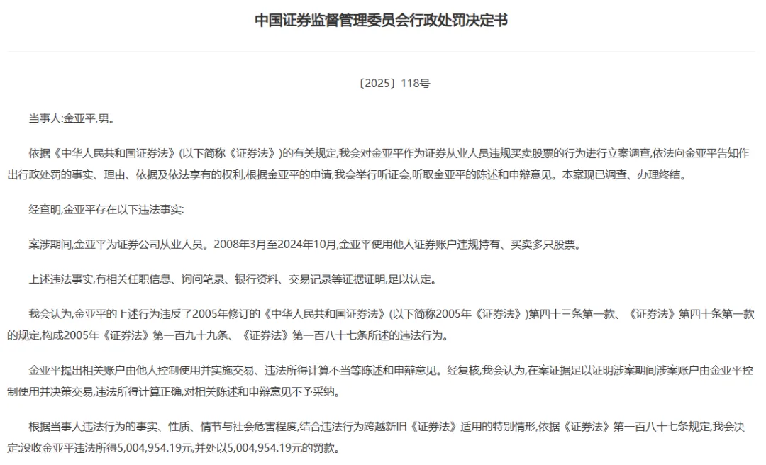 金亚平为证券公司从业人员。2008年3月至2024年10月,金亚平使用他人证券账户违规持有、买卖多只股票。根据当事人违法行为的事实、性质、情节与社会危害程度,结合违法行为跨越新旧证券法适用的特别情形,依据证券法第一百八十七条规定,证监会决定:没收金亚平违法所得5004954.19元,并处以5004954.19元的罚款,合计罚没金额约1000万元。