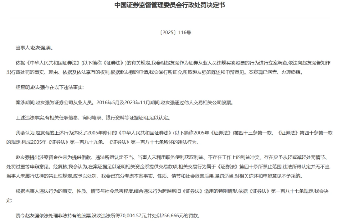 赵友强为证券公司从业人员。2016年5月及2023年11月期间,赵友强通过他人交易相关公司股票。证监会决定:责令赵友强依法处理非法持有的股票,没收违法所得70004.57元,并处以256666元的罚款,合计罚没金额约32.67万元。