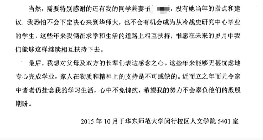 文中还对各位给予他帮助的师长、同学、好友一一给予了感谢,并表示,要特别感谢他的妻子,“没有她当年的指点和建议,我恐怕不会下定决心来到华师大,也不会有机会成为从冷战史研究中心毕业的学生,这些年来我俩在求学和生活的道路上相互扶持,惟愿在未来的岁月中我们能够这样继续相互扶持下去。”
