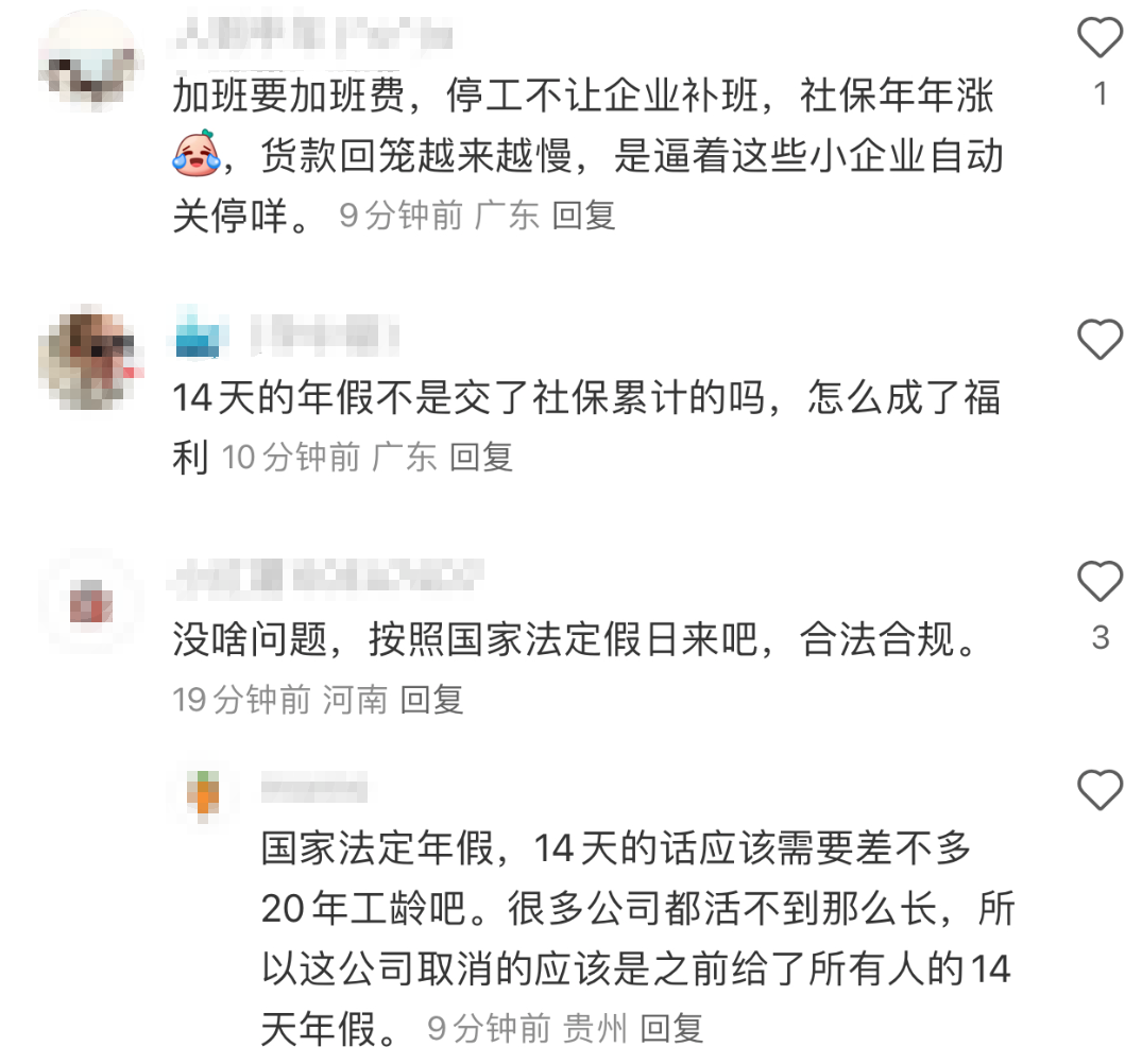 通知还称,由于大家希望公司的放假制度按照国家法律规定安排,公司将取消为期14天的年假安排,具体的年假放假时间可以参考国家规定。同时公司将取消之后所有的额外假期。