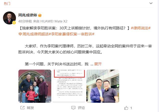 李阳代理律师周兆成说,这次胜诉对所有被网络暴力困扰的一些名人,还有企业给了一个参考,网络不是法外之地,不能肆意造谣。