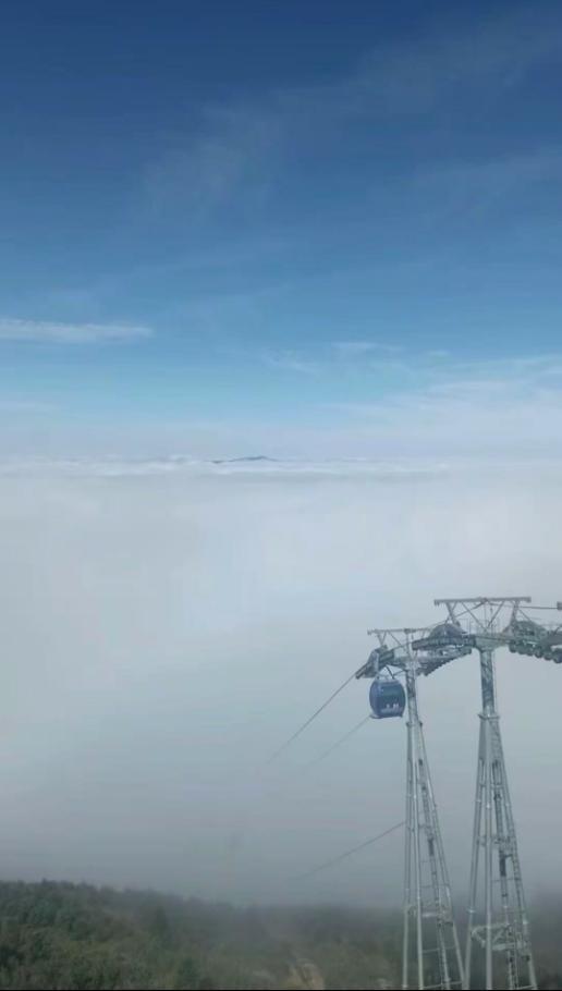 缆车悬停在空中,云雾缭绕,可以欣赏景致,“山顶风景很美的,风景这边独好。”