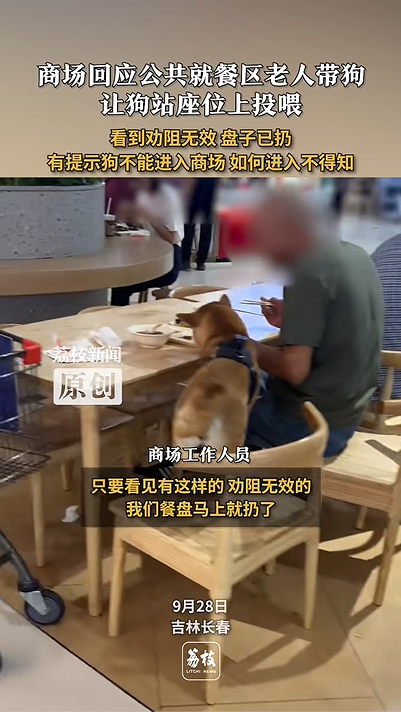 近日,吉林长春一商场,一位老人带着狗在公共就餐区域上桌。对此,商场工作人员回应称,只要看到这种情况就会劝阻,劝阻无效会将相关餐盘扔掉,有提示贴提醒大家不允许带狗进入,但什么素质的顾客都有,并且该区域约有2000多平,有20多个门,又是中午饭点,确实是没看到该顾客。