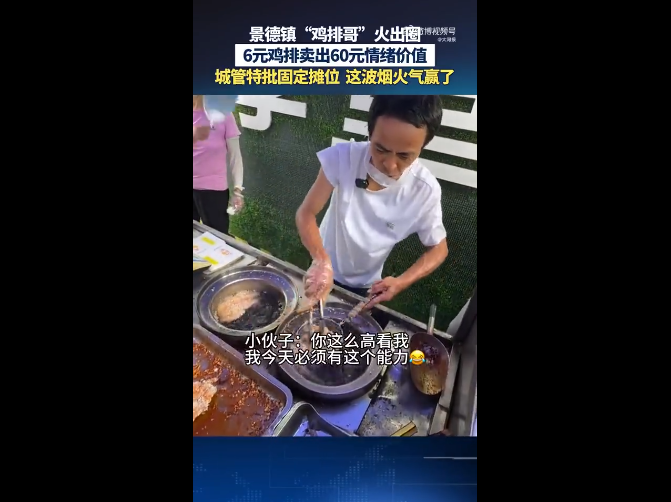 近日,江西景德镇“鸡排哥”在社交平台火爆出圈,他凭借热情亲切的服务态度、独具特色的经营方式,以及总能给顾客带来满满幸福感的“情绪价值”,圈粉无数,还被网友亲切地称作“景德镇鸡排主理人”。