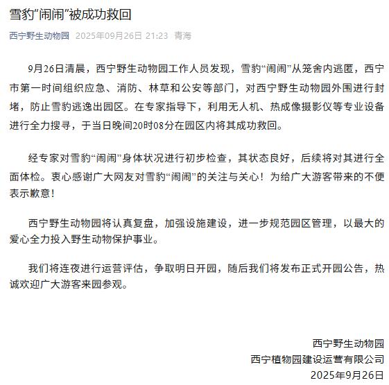 据媒体报道,9月26日,西宁市野生动物园通报称,该园一只雪豹在26日上午从封闭场馆逃离,原因正调查,园方已经启动应急机制。逃匿的雪豹“闹闹”为老年雌性个体,年龄16岁(约相当人类80岁)。当日晚间21时,园方通报,“闹闹”已被成功救回。