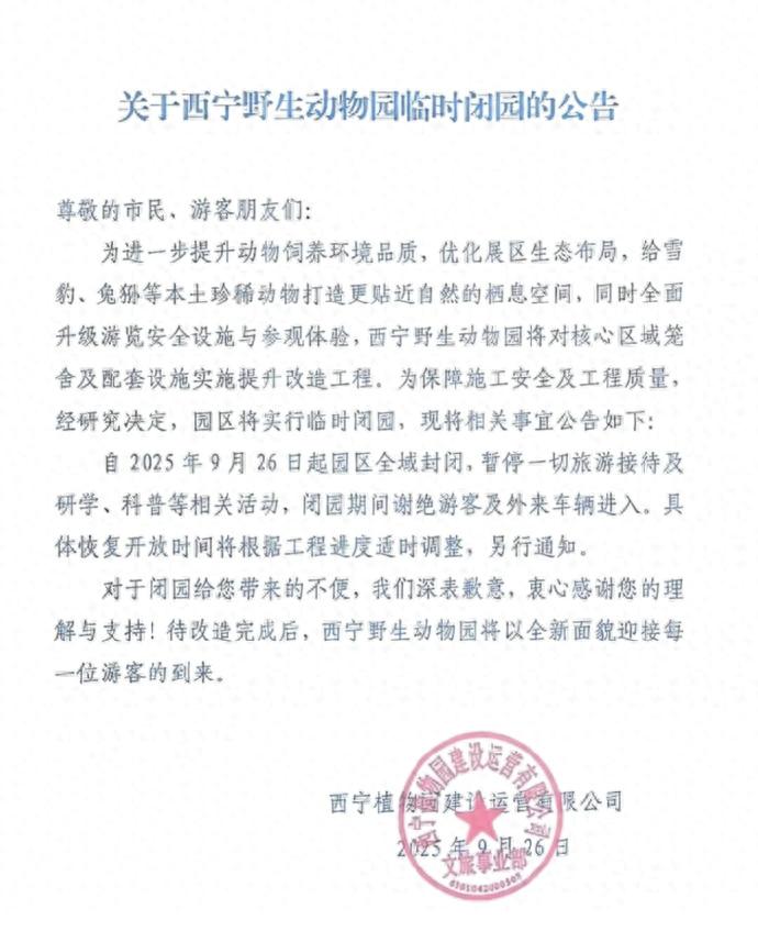 9月26日,网友发帖称,“西宁野生动物园闭园了”,并附上一张“关于西宁野生动物园临时闭园的公告”截图,引发广泛关注。不少网友猜测是否与此前热传的“‘80岁老太’越狱动物园”事件有关。