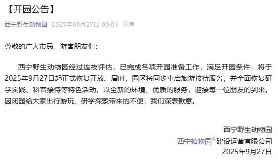 9月27日,西宁野生动物园官方微信公众号于发布开园公告,称当日起恢复开放。