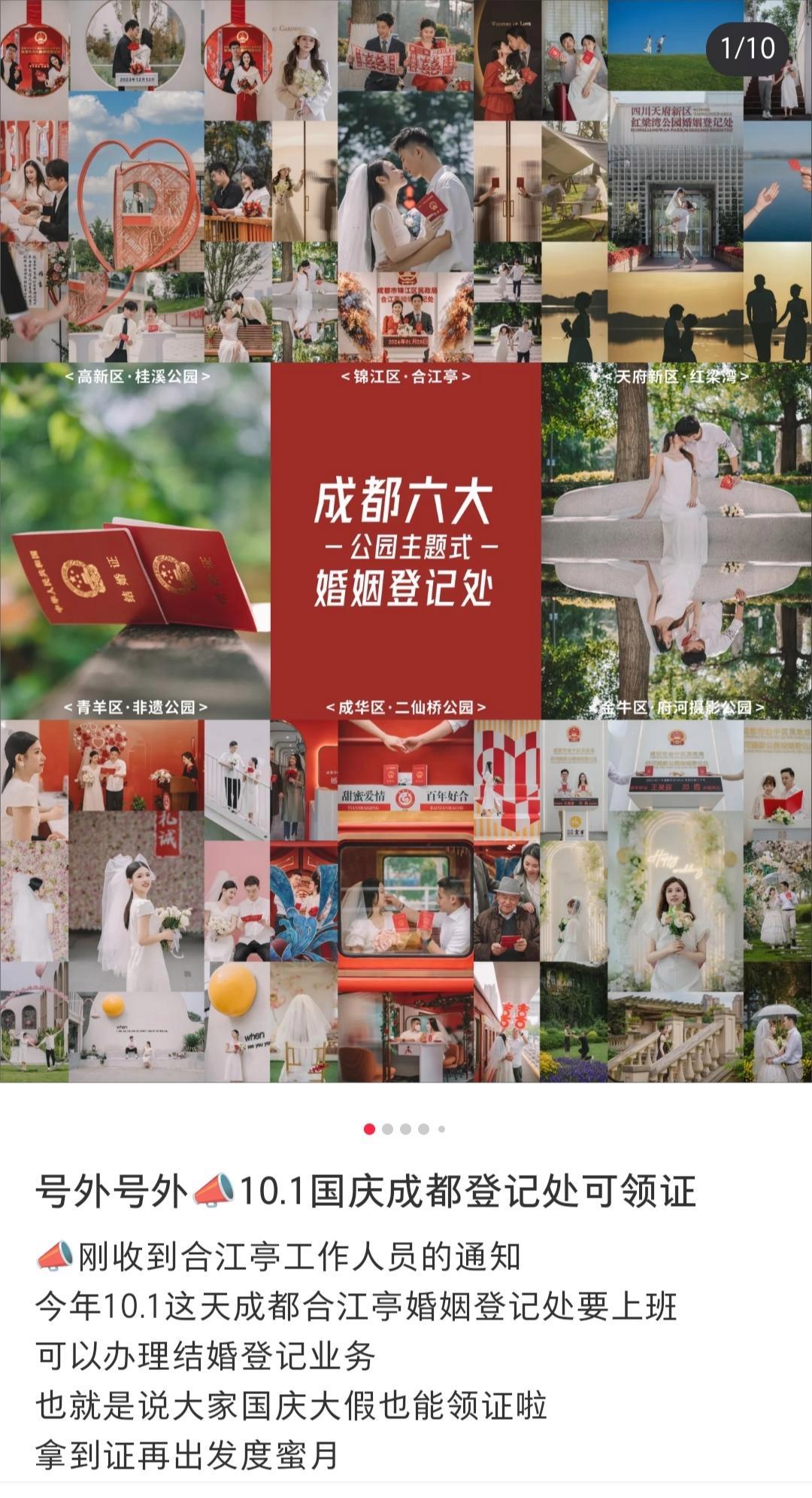 消息一经发出,瞬间引起了众多网友热议。坐标武汉的网友黎雯发文称,9月22日看到成都发布“蓉城囍事”结婚登记延时服务的消息,第一时间便在网上预约了合江亭婚姻登记处的登记名额。“我跟我男朋友原计划国庆去成都玩一趟之后,再回家领证,但看到成都10月1日都可以领证,就想顺道在这个浪漫的城市把证领了,而且非常幸运的是,我约到了!”黎雯说,“但领证跟拍却很难找,我们在各大网络平台咨询了20来个看起来还不错的摄影师,结果人家的档期都排满了,直到昨天,才有一个摄影师联系我说档期临时取消,可以给我们拍!”