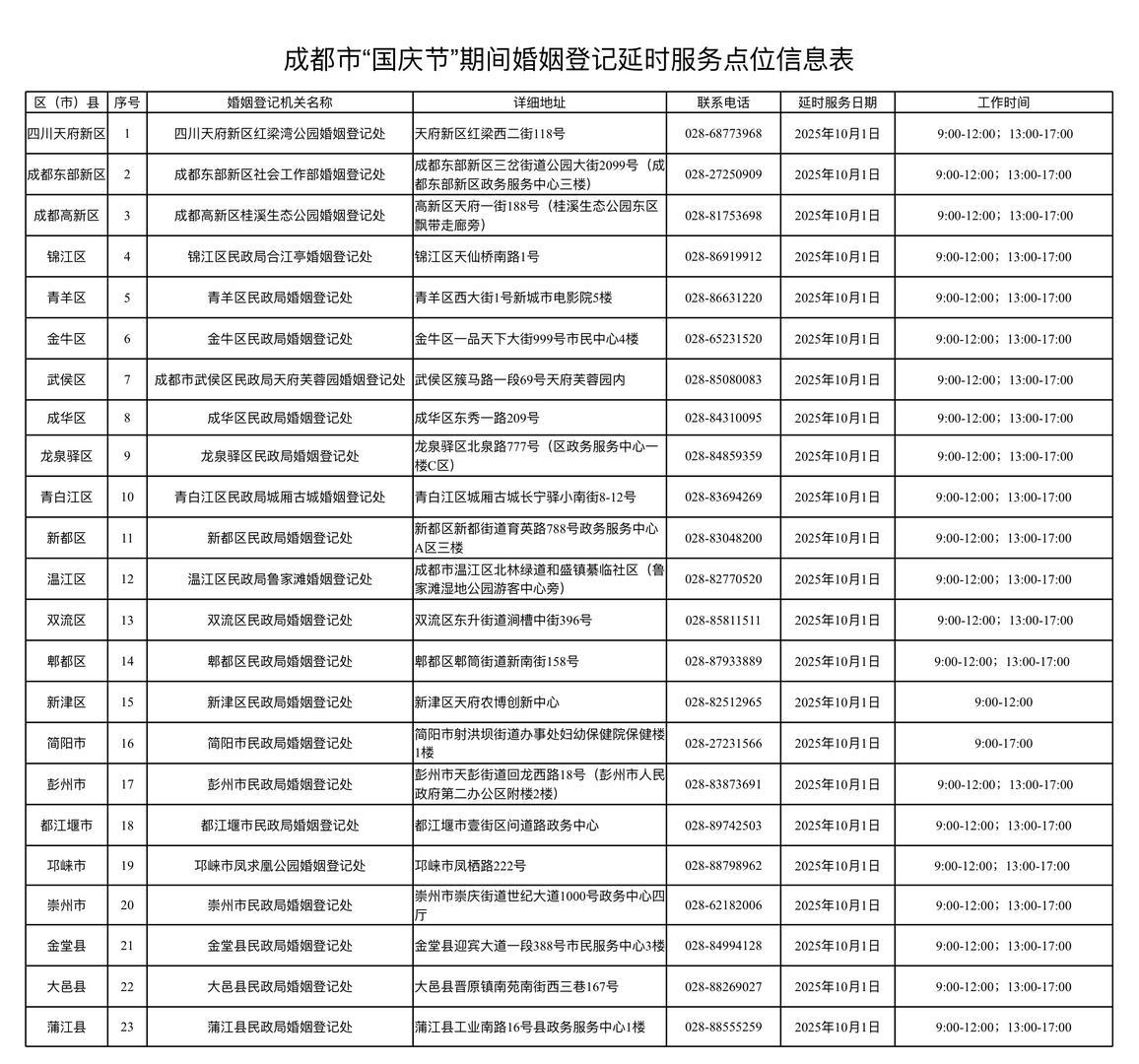 日前,为方便市民以及游客来成都办理结婚登记,成都市民政局决定10月1日在全市范围内多个结婚登记处开展婚姻登记延时服务,各区(市)县民政部门至少保障一个延时办理点。