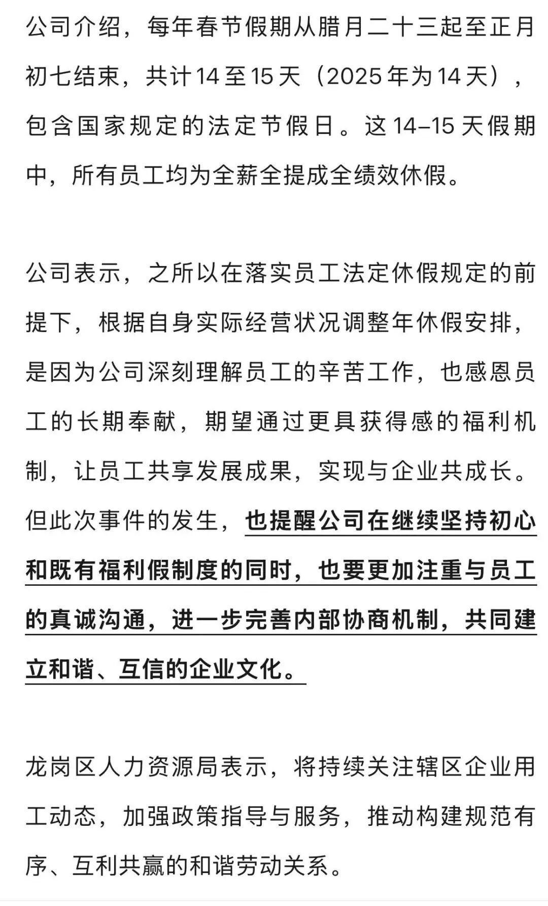 企业回应:已落实正常放假,承诺优化内部沟通