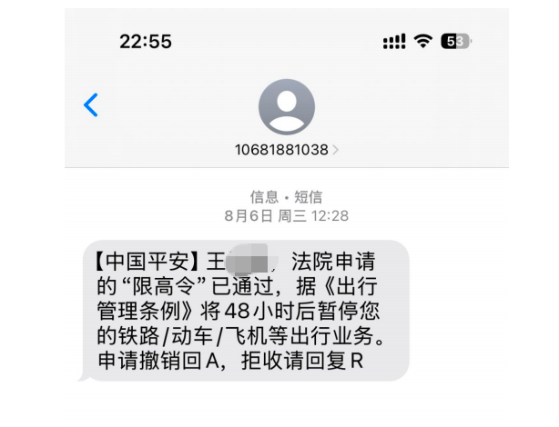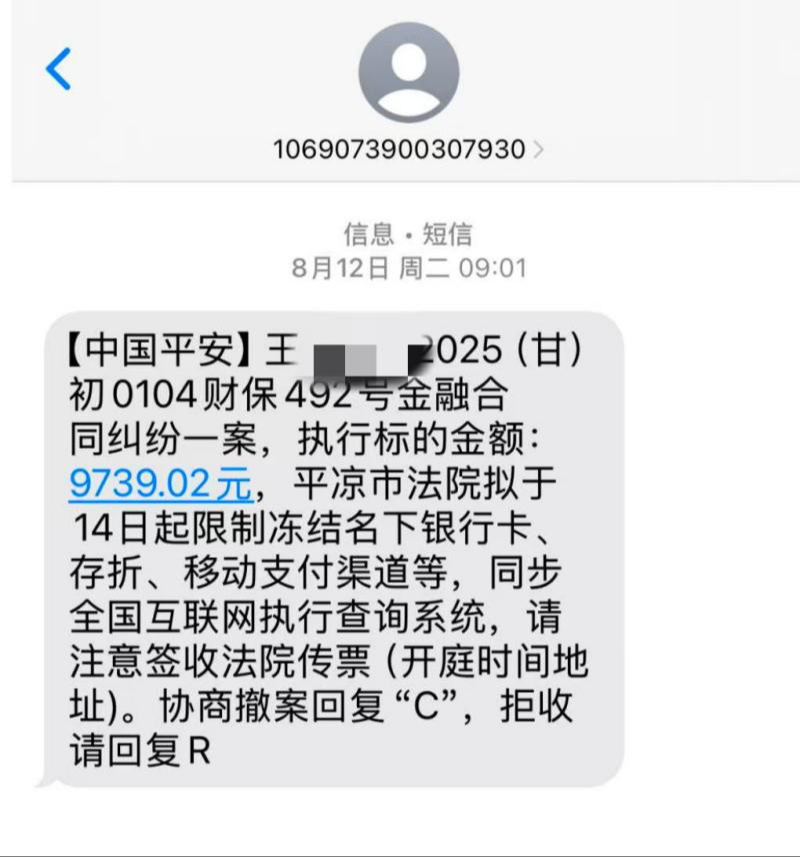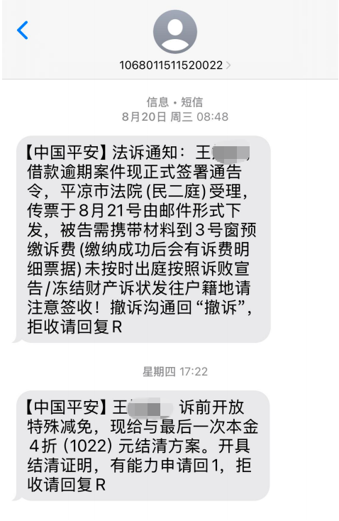 王女士介绍,自今年6月起,陆续收到陌生手机号发送的骚扰短信,对方声称她仍有“平安融易”的借款未还。王女士起初以为只是普通诈骗短信,并未在意。直到8月份,她名下5个手机号,又陆续收到106开头的带有“中国平安”抬头的催收短信,其中还夹带“平凉市法院”的立案字号和开庭信息。短信内容还包括:“【中国平安】王**,法院申请的‘限高令’已通过,据《出行管理条例》将 48小时后暂停您的铁路/动车/飞机等出行业务。”