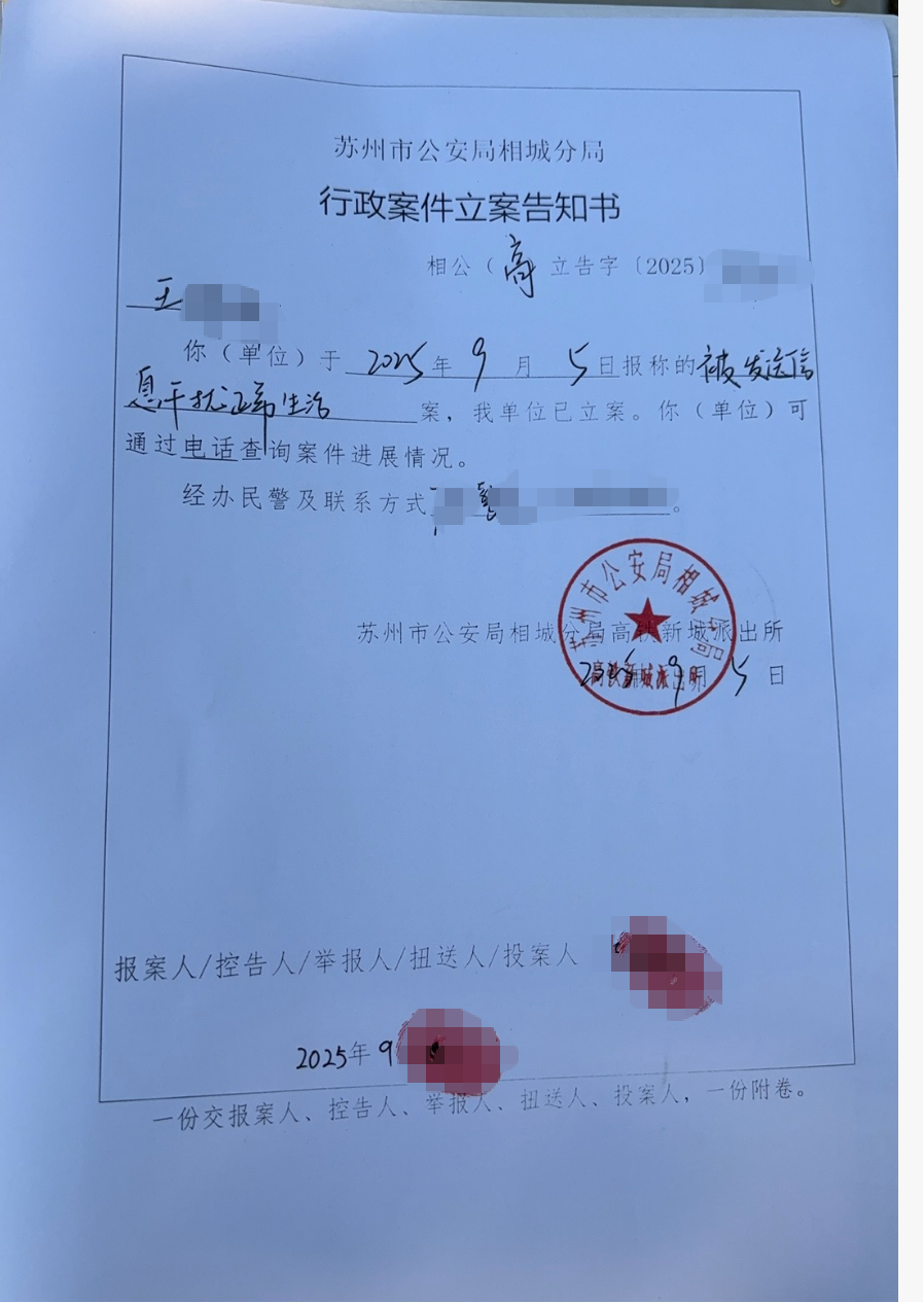 9月5日,苏州市公安局相城分局高铁新城派出所已就王女士报称的“被发送信息干扰正常生活”一案进行立案。