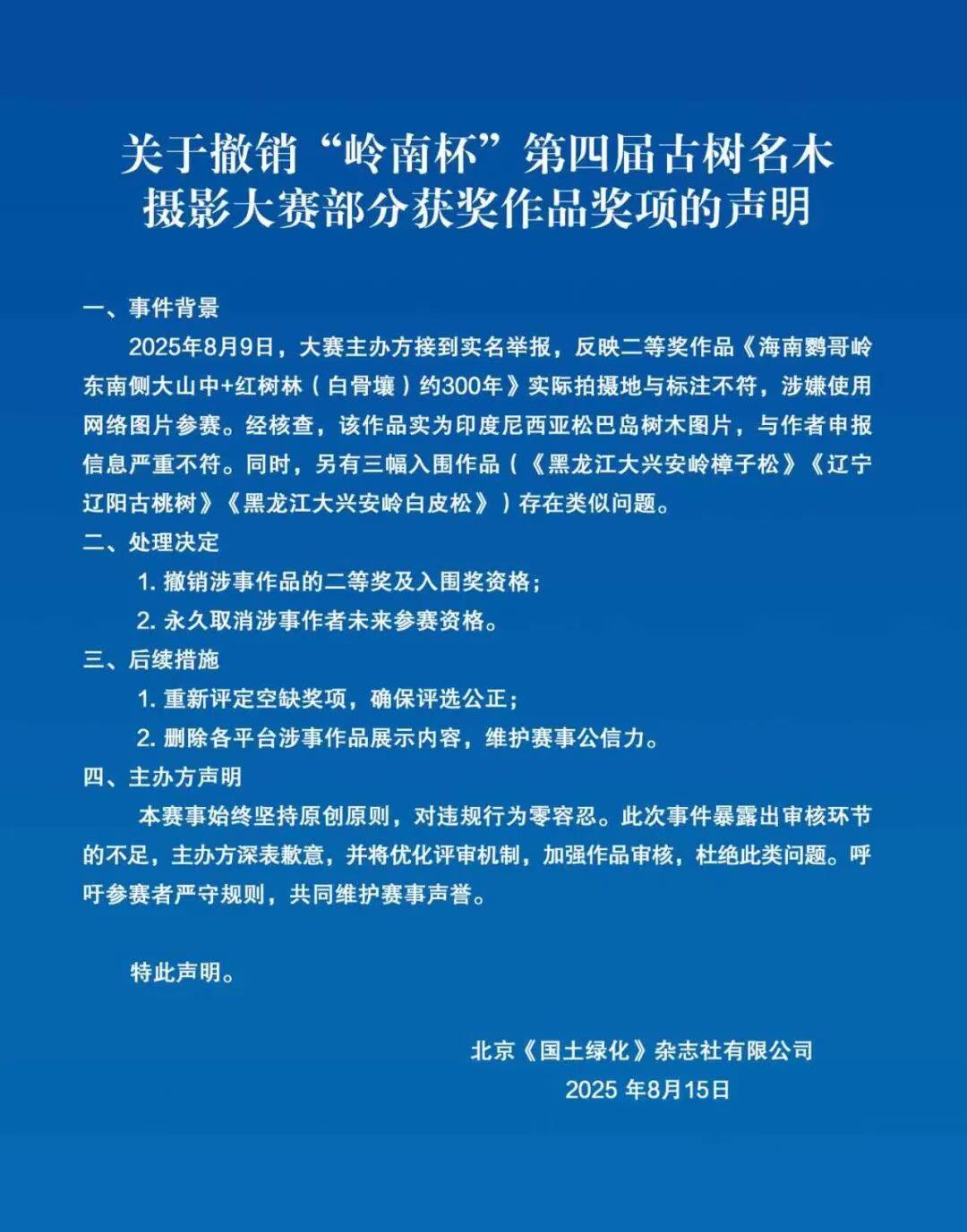 今年8月15日,“岭南杯”第四届全国古树名木保护摄影大赛主办方之一《国土绿化》杂志社发布声明称:大赛主办方接到实名举报,反映二等奖作品《海南鹦哥岭东南侧大山中+红树林(白骨壤)约300年》实际拍摄地与标注不符,涉嫌使用网络图片参赛。经核查,该作品实为印度尼西亚松巴岛树木图片,与作者申报信息严重不符。同时,另有三幅入围作品(《黑龙江大兴安岭樟子松》《辽宁辽阳古桃树》《黑龙江大兴安岭白皮松》)存在类似问题。主办方决定,撤销涉事作品的二等奖及入围奖资格,永久取消涉事作者未来参赛资格。