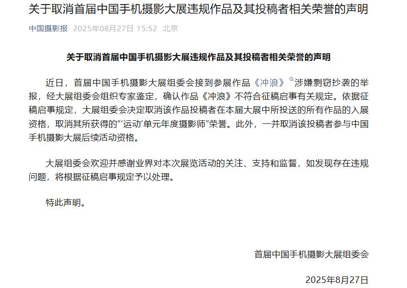 8月27日,“首届中国手机摄影大展”组委会发布声明称:近日,组委会接到参展作品《冲浪》(与前述金某某作品《冲浪》同名的另一个作品)涉嫌剽窃抄袭的举报,经大展组委会组织专家鉴定,确认作品《冲浪》不符合征稿启事有关规定。组委会决定取消该作品投稿者在本届大展中所投送的所有作品的入展资格。