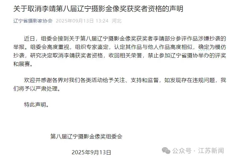9月13日,第八届辽宁摄影金像奖组委会发布声明称:近日,组委会接到关于第八届辽宁摄影金像奖获奖者李靖部分参评作品涉嫌抄袭的举报。组委会高度重视,组织专家鉴定,认定其作品与他人作品高度相似,确定为模仿抄袭,研究决定取消李靖获奖者资格,收回相关荣誉,禁止参加辽宁省摄协举办的评奖和展赛。
