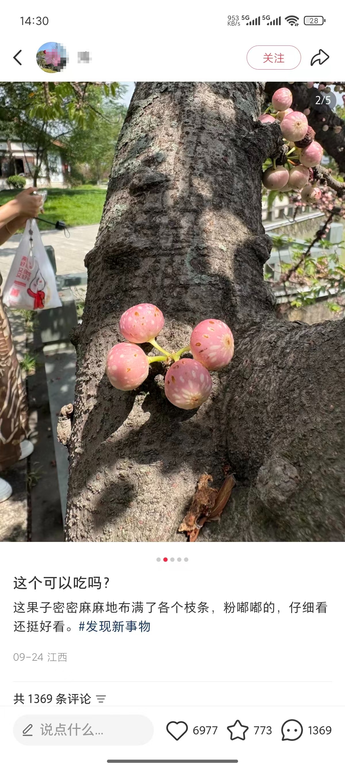 国庆假期将至,不少网友早早开启了“旅行模式”。近日,有小红书网友在旅途中发现,路边有一些长满了饱满粉色果实的大树,她好奇地拍照发到社交媒体上,向网友提问这些果子是否可以食用。评论区立即有人表示这种树或许是“聚果榕”,可以吃,而且很大概率吃到“高蛋白”(即寄生虫)。有细心的网友发现,这些果子与大家常见的无花果的外形也很相似,进一步激发了大家对这种果树的好奇心。9月30日,记者联系到多位植物学专家,向他们请教这类果实是否可以食用。