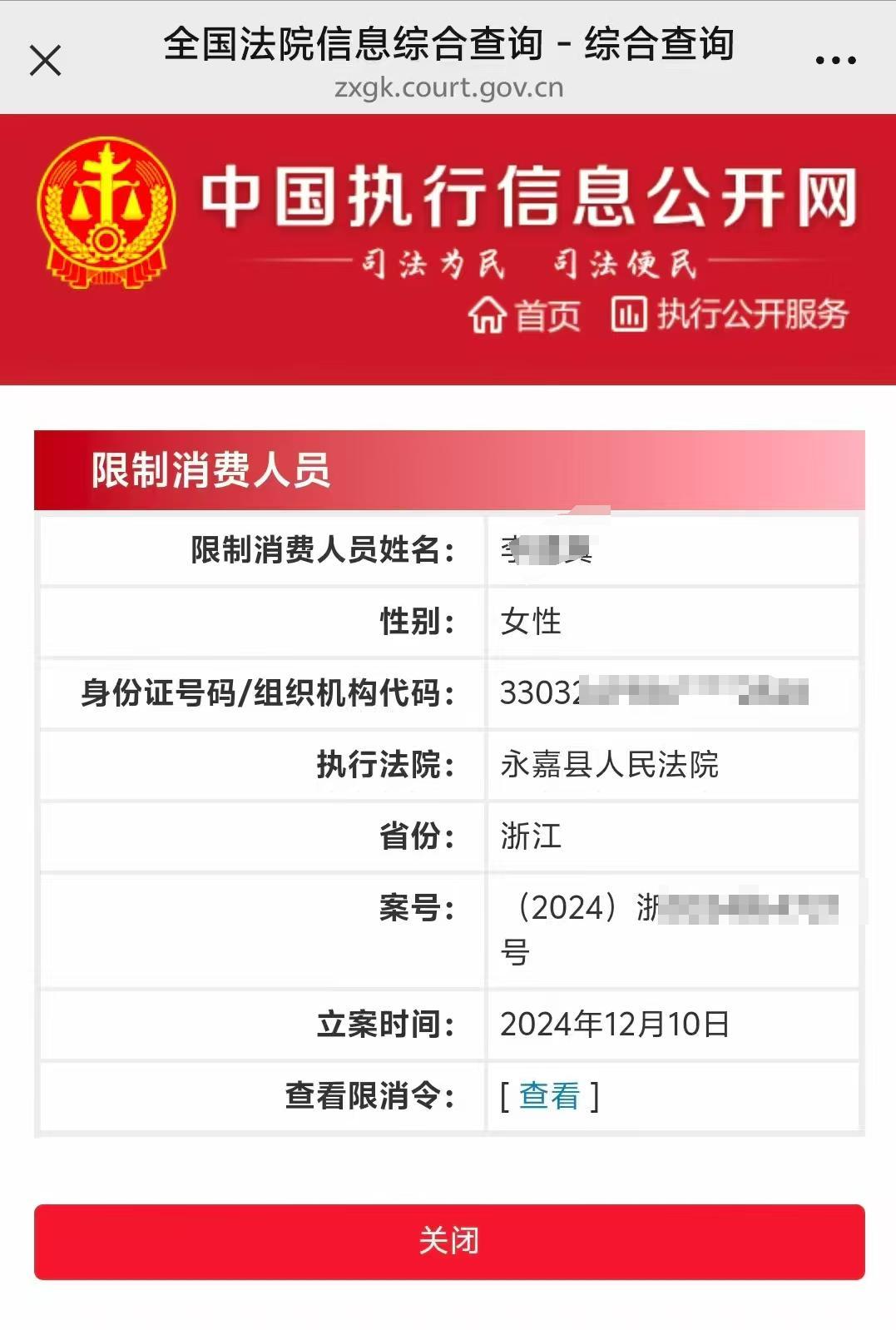 周女士告诉记者,她通过中国执行信息公开网查询到,李某某已于2024年12月被永嘉县人民法院被列入限制消费人员名单。