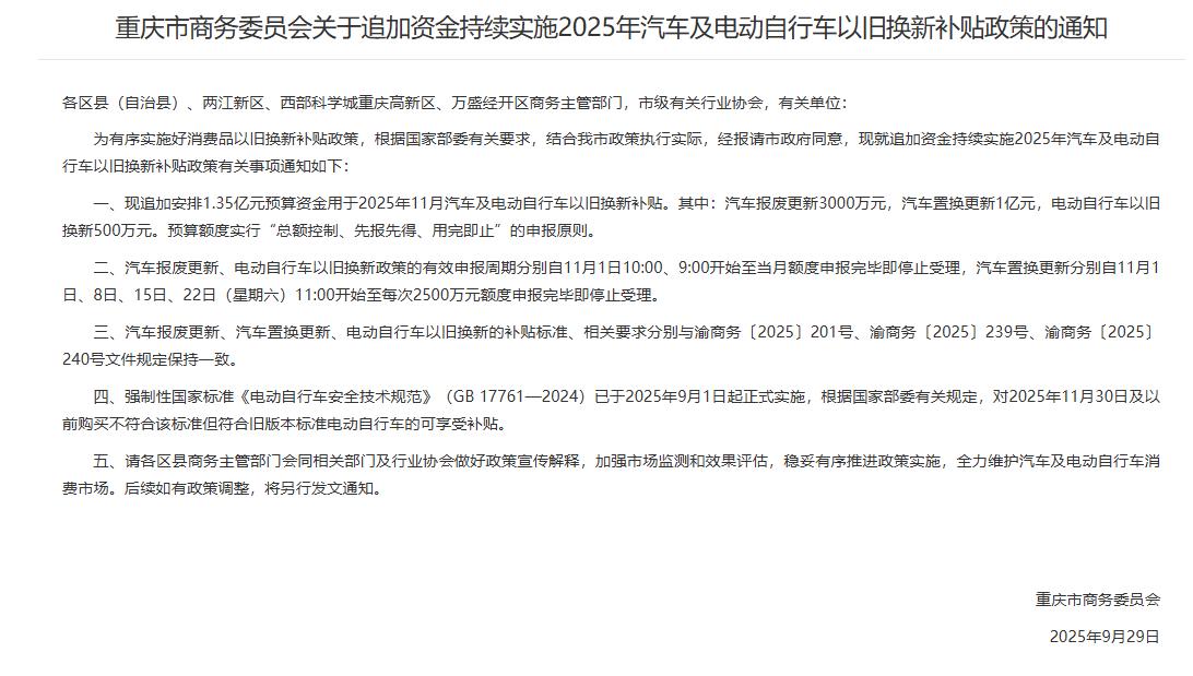 以重庆市为例,8月15日、9月29日,分别追加安排3亿元、1.35亿元资金,用于汽车置换更新补贴以及汽车及电动自行车以旧换新补贴。