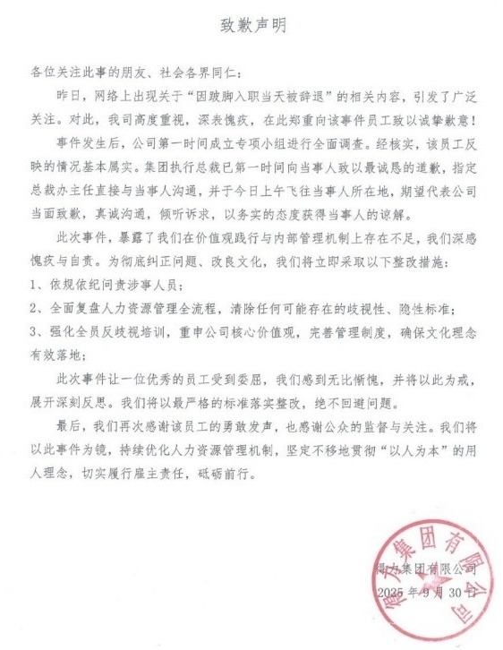 9月30日,“得力集团辞退跛脚员工”的话题登上微博热搜,引起广泛关注和讨论。当天,得力集团有限公司针对此事发布《致歉声明》,表示该员工反映的情况基本属实。集团执行总裁已第一时间向当事人致以最诚恳的道歉,指定总裁办主任直接与当事人沟通,并于30日上午飞往当事人所在地,期望代表公司当面致歉。