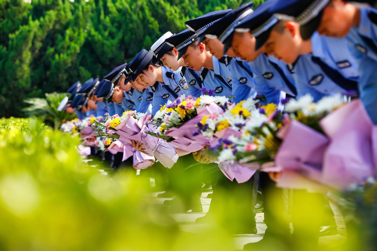 9月30日,民警在天津市滨海新区塘沽烈士陵园献花。新华社发(杜鹏辉摄)