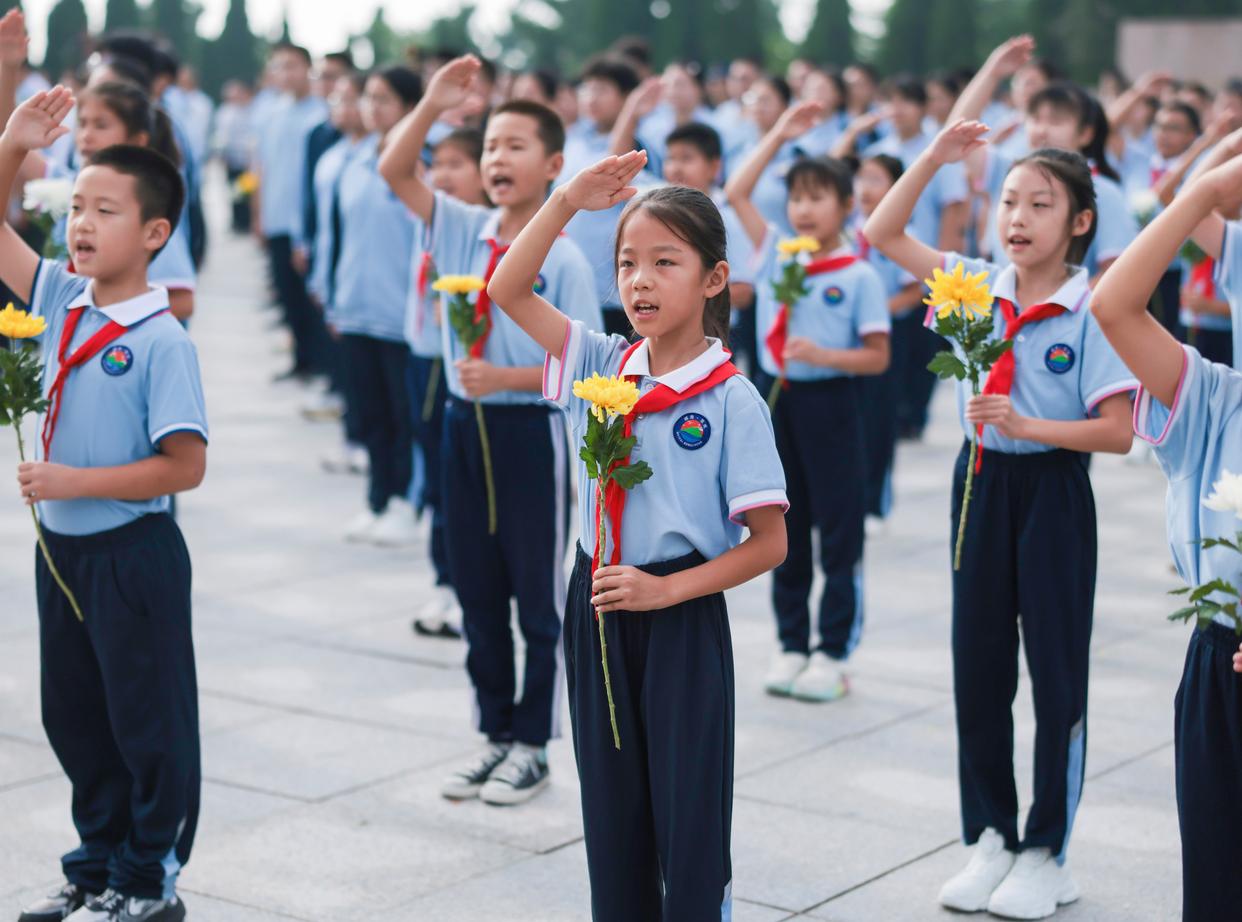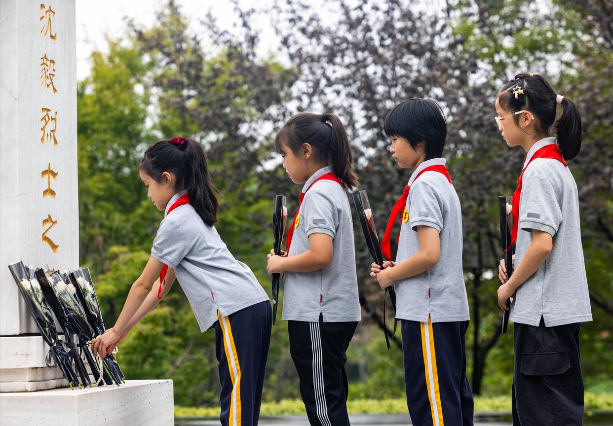 9月30日,少先队员在江苏省泰州市烈士陵园献花。新华社发(汤德宏摄)