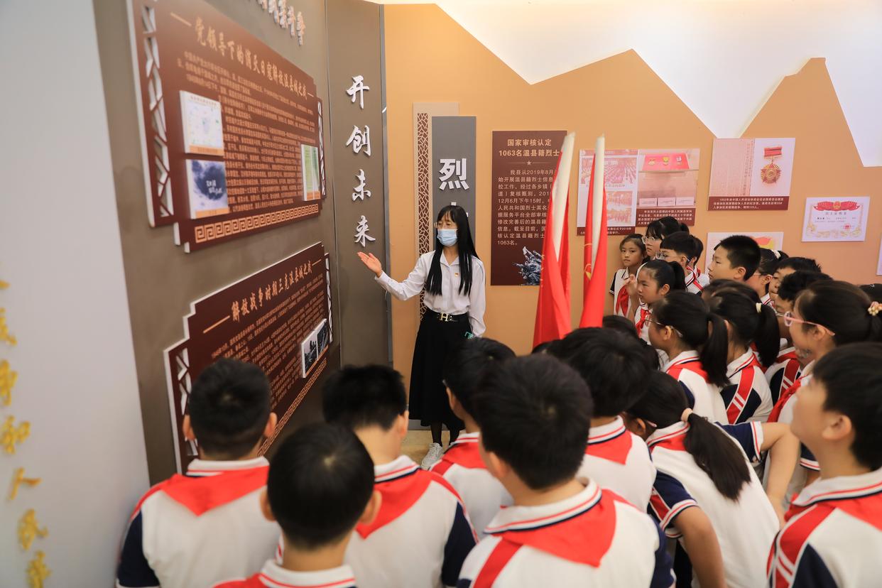 9月30日,河南省温县城内小学学生在温县烈士陵园的陈列馆聆听英烈事迹。新华社发(黄福兴摄)