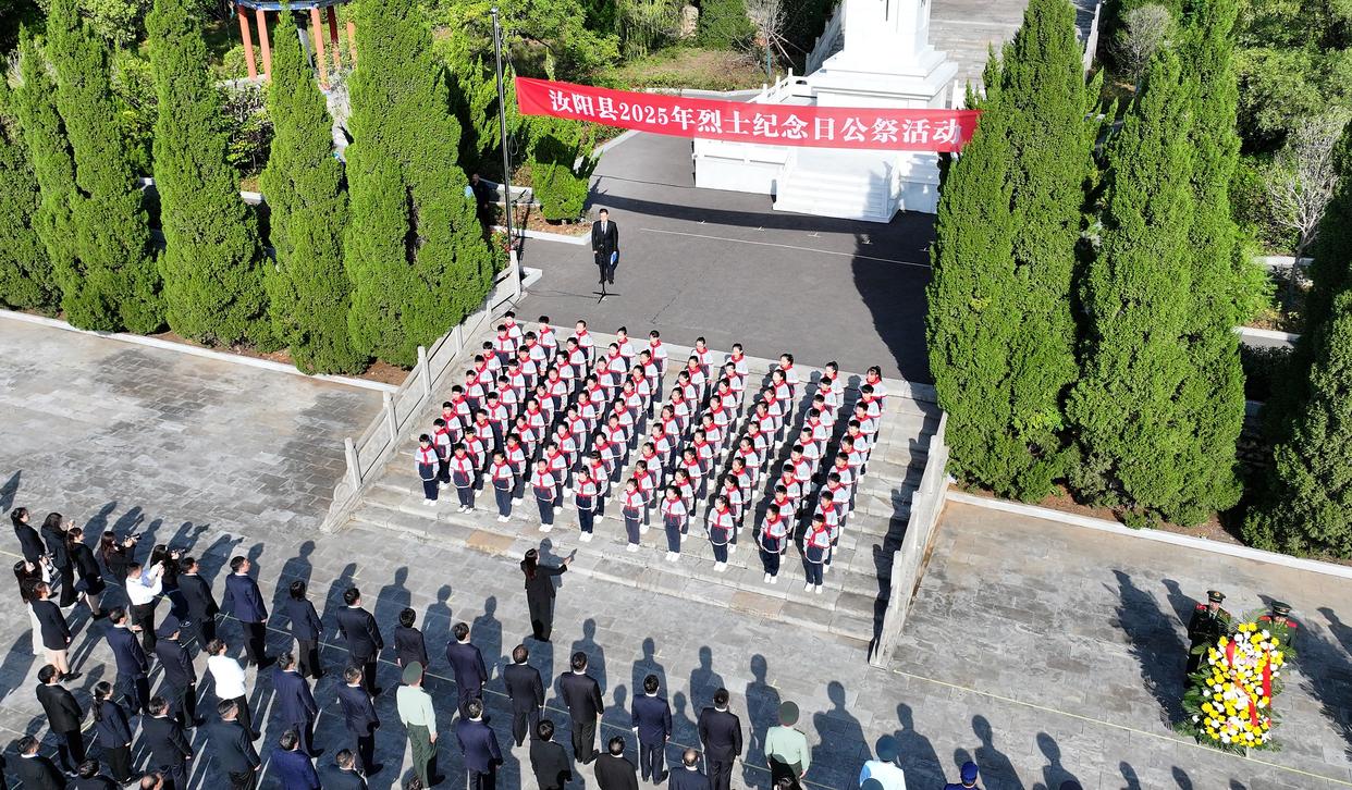 9月30日,在河南省汝阳县烈士陵园广场,少先队员唱中国少年先锋队队歌(无人机照片)。新华社发(康红军摄)