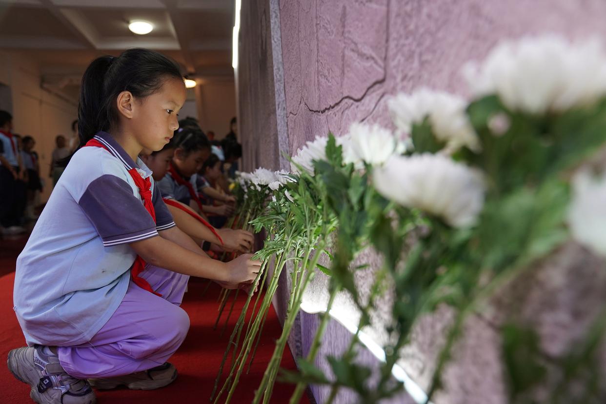 9月30日,在南昌八一起义纪念馆,学生向革命先烈敬献花束。新华社记者 万象 摄