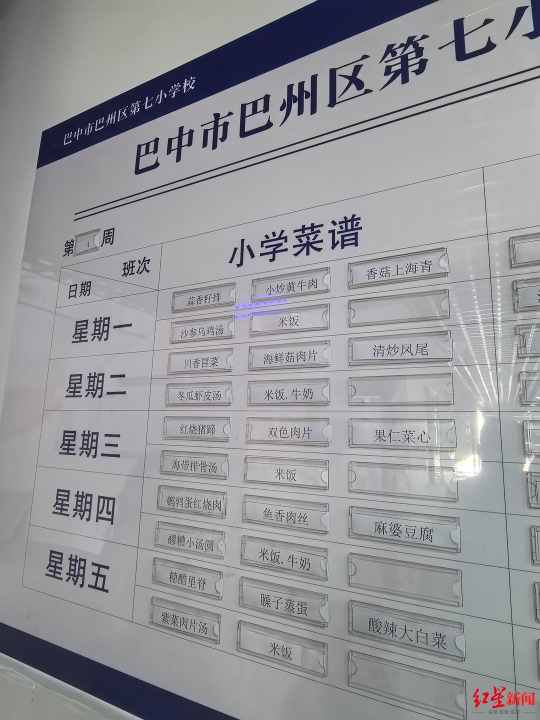 学生每天的菜品都不一样。校长胡清华带着红星新闻记者前往食堂内的公示栏,上面公布了学生饭菜一周食谱:每天两荤一素一汤,每周二和周四,每个学生还有一盒牛奶,每天不低于6种食材。食堂严格按照公示栏执行。