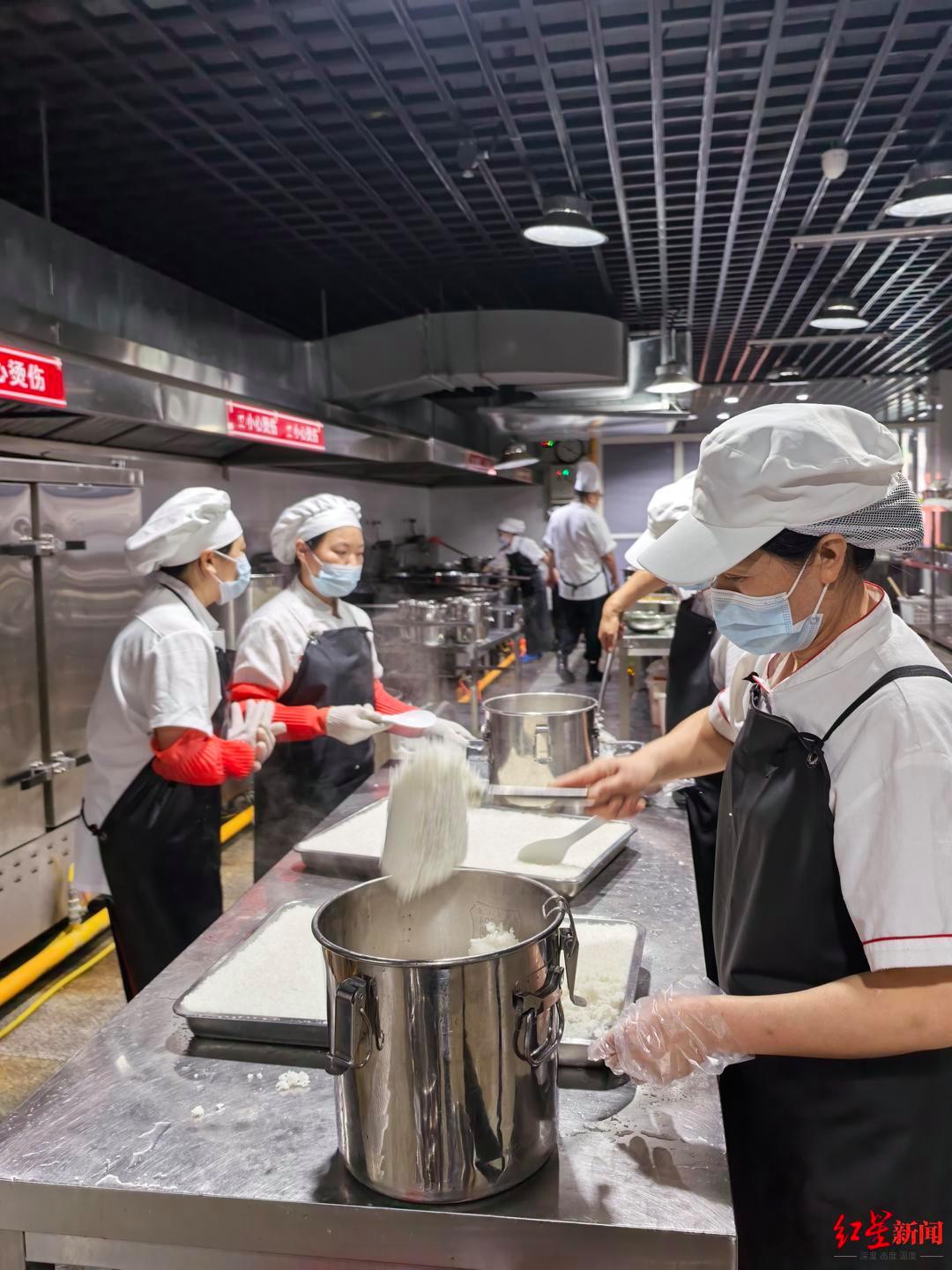 厨房内,厨师何潘正在炒鱼香肉丝,油下锅烧好后,他倒入肉丝、莴笋丝、胡萝卜丝和木耳丝,拿着大铲在大锅里不停翻炒。他笑着告诉红星新闻记者,全校2000余名学生吃饭,煮饭、炒菜除了考技术,也是一个体力活。另一边,受聘前来当工人的家长们正在忙着分装米饭,洗餐盘,准备分餐配送,一刻不停。