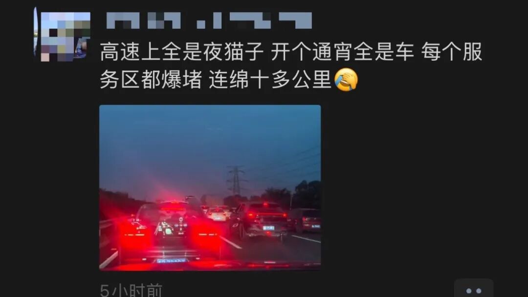 今天早上5点,他在江苏刘老庄服务区停留,拍下了服务区的车流:“都停满了”。