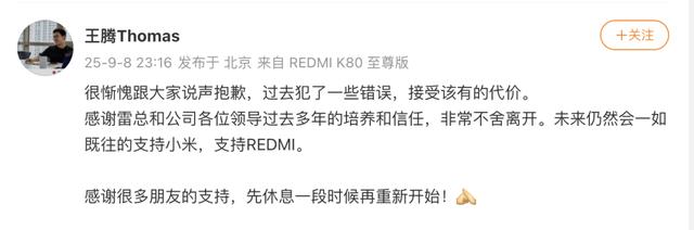 随后,王腾发布微博回应被小米辞退:很惭愧跟大家说声抱歉,过去犯了一些错误,接受该有的代价。